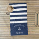 Treat your bridesmaids to these nautical chic beach towels featuring classic navy blue and white stripes with a white anchor illustration and "bridesmate" in white lettering. Personalize with each bridesmaid's name in handwritten brush script lettering.