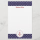 This stationery features a Moroccan Quatrefoil pattern in navy blue and white. A red anchor provides a nautical motif to the design. Personalize this stationery with a name.