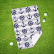 This decorative design features both a dark navy blue anchor and a boat wheel with white stripes. The nautical illustration creates a modern and unique golf towel with personalized text and background color.