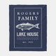 Dark blue lake house fleece blanket featuring a rustic trout image and bold serif typography. Personalize this design with your family name and year established. Further customize this design by selecting the "customize further" link.