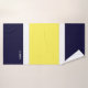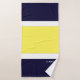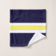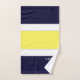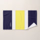 Personalized navy blue and yellow bath towel set. Navy blue with name field in block text beneath a yellow and white with grey border stripe.