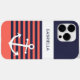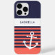Simple contemporary ship anchor, on a classic and chic navy blue and light summery peach orange, coral red colored stripes pattern. With room to personalize or customize with a name, initials, or monogram of your choice on a white colored background. Beautiful, modern, and cool cover for the trend-savvy and art-loving hip trendsetter, artsy motif lover who wants to protect their phone from dust and dirt, wear and tear. This design is available in Apple iPhone 6, 7, and 8 Plus, 10 or X, XR, XS, 11, 12, 13 Mini, 14, 15 Plus, and Pro Max cellphone cases. Show off your style, look fashionable trendy, and feel stylish with a unique design on a mobile device accessory of your choice.