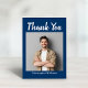 Thank you card features a photo framed in navy blue (can be modified) with simple custom text in white that can be personalized with "Thank You" and the name. Includes a coordinating navy blue gingham tablecloth plaid pattern on the back of the card, along with a second photo. Perfect for a casual outdoor summer event.
