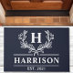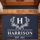 Welcome guests with elegance and warmth using this personalized navy doormat. The classic laurel wreath design, customizable monogram, and established year create a timeless and inviting look. Crafted with durable materials, this doormat is perfect for adding a touch of sophistication to your porch or entryway.