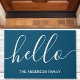 Welcome guests with a warm and friendly greeting using this personalized doormat. Featuring a modern script "hello" in white on a stylish navy blue background, this customizable doormat adds a touch of charm to any entryway.