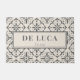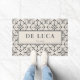 An elegant personalized newlywed couple doormat featuring a pretty diamond shaped stylized repeated floral pattern in gray and cream hues. Add character to your new home together with your name and date established.