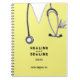Creative nurse notebook featuring yellow hospital scrubs, stethoscope, funny quote and a Swiss Army knife. Edit text to add nursing school grad name and year.