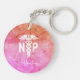 Personalized Nurse Practitioner Pink Medical Keychain has modern designed background with pink and orange watercolor ombre. A white medical caduceus symbol and "NP" in bold white lettering are on the center. Name is in white trendy hand lettered script. Click personalize template option and enter name.