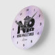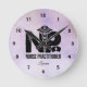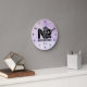 Personalized Clock for a Nurse Practitioner has a purple watercolor background. This design features the Initials NP, a caduceus, and nurses hat. Great gift for nurses day or to show nurse appreciation