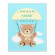 Cute teddy bear gliding on parachute with fluffy clouds on a light blue sky. Personalize with child's name. Colors are also customizable.