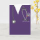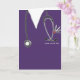 Creative nursing school graduation card template featuring purple hospital scrubs. To personalize edit text to add name of nurse graduate.