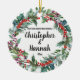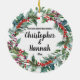 Custom Our First Christmas Married, Personalized Couple Gift round Ornament, for bride groom newly wed, mr and mrs present decoration, wedding just married them keepsake, personalised son daughter year date, winter holiday party from 2024, December tree bauble elegant greenery, white green red botanical foliage, modern rustic vintage classic script, watercolor ceramic ornament for them, housewarming new home Christmas present from parents