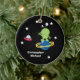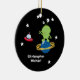 This round shaped ceramic ornament has an outerspace design. There is an alien standing on a planet with stars all around. A spaceship is also to the left. You can customize the name at the bottom. Zenware Designs