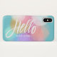 Pretty pastel paint splotches in pink, peach, lilac, aqua, gold, blue and white are scattered across this abstract stylish design that features "Hello" text in modern brush script typography. Personalize with your name or other desired text for a case that is uniquely you.