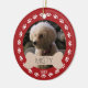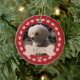 Personalized Paws & Bone Dog Photo Ornament featuring a white dog paw frame set on a christmas holiday red. Easy to customize with your pets photo, name & date.