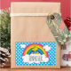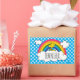 Personalize this super cute design with Woodstock sitting on a cloud in front of a colorful rainbow.