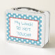 This is a standard metal lunchbox that appears to work just fine. We designed this box ourselves with an uploaded photo and custom text on the front and back. It looks absolutely beautiful except the front of the lunchbox is not centered like it shows in the photo. The print borders don't align with the inset flat part of the box where the preview photo online showed it perfectly centered in there. The back looks nice and centered though.