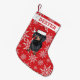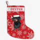 Funny cute christmas holiday stocking for your pet featuring a dachshund dog wearing a red xmas hat, their name, a traditional red background that can be changed to any color, and a scattering of winter white snowflakes.