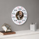 The design is accented with cute, subtle cat-themed decorations, including pink-and-red hearts, green-and-teal paw prints, and stylized cat ears and whiskers. The center features a customizable circular area perfect for displaying a favorite photo of your beloved cat or pet, along with a custom name. This clock is a perfect piece of decor for a nursery, kitchen, living room, or any space that needs a touch of personalized, feline fun.