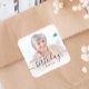 Modern birthday party stickers featuring a custom photo. Easily replace the sample image with a photo of the guest of honor. The word "birthday" appears in elegant black handwriting script. Personalize the text with the name and birthday year in black sans serif font. A white gradient overlay helps make the text pop.