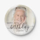 Modern birthday party paper plates featuring a custom photo. Easily replace the sample image with a photo of the guest of honor. The word "birthday" appears in elegant black handwriting script. Personalize the text with the name and birthday year in black sans serif font. A white gradient overlay helps make the text pop.