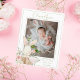 Sweet watercolor bunny rabbit in a basket accent your favorite photo for this adorable birth stats baby girl announcement. Green typography and script. Soft pastel color flowers all around. Sweet customizable message on reverse of this cute baby girl birth announcement.