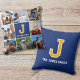 Create your own custom photo pillow! This stylish template showcases eight of your favorite photographs, and is personalized with a monogram letter and text — ideal for a single name, pet's name, sports team, or family surname. Both sides can be customized with the same or different text. You can also change the background color by using the design editor tool. This stylish design features a retro block font, with a sports jersey style, and is perfect for all ages, including kids, teenagers, and adults. Custom pillows are a lovely addition to your home, and make a unique gift for friends and loved ones. Printed colors: yellow gold, dark blue navy and white.