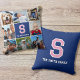 Create your own custom photo pillow! This stylish template showcases eight of your favorite photographs, and is personalized with a monogram letter and text — ideal for a single name, pet's name, sports team, or family surname. Both sides can be customized with the same or different text. You can also change the background color by using the design editor tool. This stylish design features a retro block font, with a sports jersey style, and is perfect for all ages, including kids, teenagers, and adults. Custom pillows are a lovely addition to your home, and make a unique gift for friends and loved ones. Printed colors: pink, dark blue navy and white.