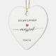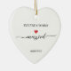 Elegant ceramic heart ornament celebrating a marriage, featuring customizable names, a beautiful script "married" with a red heart accent, personalized photo, names and date. Perfect marriage gift or wedding shower keepsake. Available in white ceramic with gold hanging ribbon.