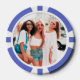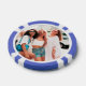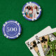 Personalized poker game chips with a custom photo and your own text (family name, established year, etc). This design in purple includes the number 500 but it can be edited with any value amount.