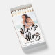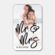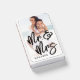 This matchbox design features a full photo background with a subtle white gradient behind the text, making “Mr. & Mrs” in large black handwritten script stand out beautifully. The wedding date appears at the bottom left in a clean black serif font for a classic, elegant touch.
