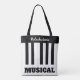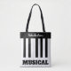 A stylish tote bag with music themed panel on both sides. The design is of black and white piano keys, with text to personalize above and below the keyboard.