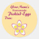 Use these personalized round stickers for the tops of your canning jar lids on your homemade pickles and relish. The template has an image of some pickled eggs cut open and arranged to look like the petals of a flower. You can change the background to any color you want. The canning stickers say, "Your Name's Homemade Pickled Eggs." Add your name to the template to personalize. There is also room for you to write in the date. You can change or remove any of the words in the template. You took the time to make them, so why not put some of these homemade pickles lables on your jar lids and make your goodies look as good as they taste? More custom labels for canning and pickling at Alina's Pencil.