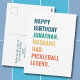A bold pickleball-themed birthday postcard featuring stacked typography in a clean, modern layout. The front design is fully editable, allowing all text to be customised — including the name and descriptive wording — making it easy to adapt for different recipients and occasions.