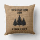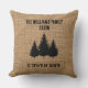 Personalized pillow with burlap print and pine trees with the coordinates.