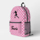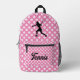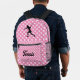 Personalized pink backpack with tennis ball print and female silhouette of a tennis pro. Custom color backpack for tennis lover, fan, player, coach etc. Cute design with custom name or monogram. Cool Birthday gift idea for kids going back to school.