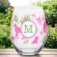 Personalized Pink Cheetah Greenery Floral Monogram Stemless Wine Glass