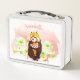 Cute watercolored pink floral lunch box with a red panda / lesser panda mom holding its baby. Personalize with your name. You can find matching red panda products at my store.
