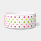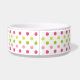 This ceramic dog food bowl has a pink, fuchsia, and green polka dot pattern in the background. In the middle, there is a large pink bone with an easily customized name of your doggie written in white.