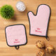 oven mitt & pot holder set. Featuring a chic bow design in soft pink and bold red, this custom kitchen set brings style and function to your cooking routine. Personalize it with your name or initials for a unique and thoughtful touch.