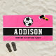 Personalized soccer themed beach towel design for kids and teens features a soccer ball customized with the player's uniform number, custom text for the player's first or last name, and modern text for the soccer club team name. Makes a unique favor gift for tournaments and pool parties with the team! Stylish and modern design features sporty varsity jersey lettering and simple horizontal stripes. The color scheme of hot pink, black and white can be modified to coordinate with your team colors.