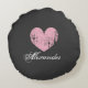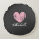 Personalized pink weathered heart round pillow . Cute gift idea for bride and groom, newly weds, husband and wife couple etc. Vintage design in grat and pink colors. Elegant script text design. Cute home decor cushion for sofa or bed.