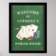 Personalized poker room welcome poster sign featuring playing cards and poker chips on card table green felt and your custom text. The sample shows WELCOME TO NAME'S POKER ROOM. OPTIONS: The sample is shown in a 18x24" size on Value Paper (Matte); other standard and custom print sizes, paper quality and framing, Digital Download file for local printing or transferring the design to a foam board, banner, tapestry or other product options are available on the ordering page. TIP ON RESIZING: Choose Custom Size for even borders by changing the height and width proportionately AFTER clicking the UNLOCK icon. ASSISTANCE: For help with design modification or personalization, color change, resizing, transferring the design to another product or you would like coordinating items, contact the designer BEFORE ORDERING via the Zazzle Chat MESSAGE tab below or email makeitaboutyoustore@gmail.com.