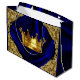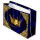 Prince baby shower gift bag with beautiful gold crown on an elegant royal blue and gold background. This prince gift bag is easily customized with the text of your choice, and you can move and resize the crown as needed.