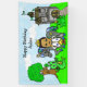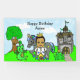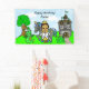 Little Prince with crown and sword, and his pet horse, dragon and frog with a castle and tree with an owl in the background, personalized Birthday banner. Ethnic prince African-American, Hispanic or Indian.