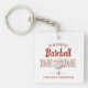 Proud baseball mom keychain featuring modern retro text and a baseball in classic colors of red and white, personalized with your childs name.