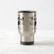 Proud football mom travel mug featuring modern retro text and a american football ball in the colors of black and white, personalized with your childs name.