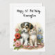 Cute watercolor style puppy and kitten with pretty flowers and a bird on a child's first birthday card. Name and sentiment can be changed. AI assisted graphic purchased with commercial use. Artwork: RedHeronLighthouse