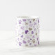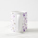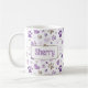 A personalized purple hearts paw prints mug custom printed with your name! It's designed with a pattern of purple and brown hearts and paw prints that wraps around the mug. Your personalized name is printed on both sides of the mug in purple over the cute hearts and paw prints pattern. It makes a great gift for anyone who loves their pets, cute paw print designs, and purple drinkware for their kitchen.