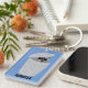 Keep your keys secure or create a personalized gift that's perfect for fans of raccoons. This keychain features a cute illustration of a raccoon peering out of a garbage can with your name below in bold black lettering. All set against a light blue background.